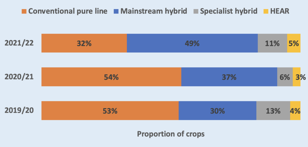 “While the main place for hybrids has traditionally been in the later drilling slots and they continue to dominate here, it is interesting to see that just over half the mainstream ‘double low’ crops sown up to August 20 this season were hybrids.