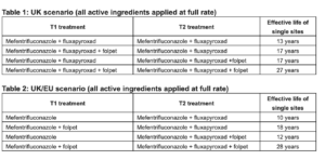The modelling work assessed the expected effective life of the treatment programmes (the time between the introduction of the fungicides and the moment at which effective disease control is lost) and investigated how the addition of folpet can extend this effective life.