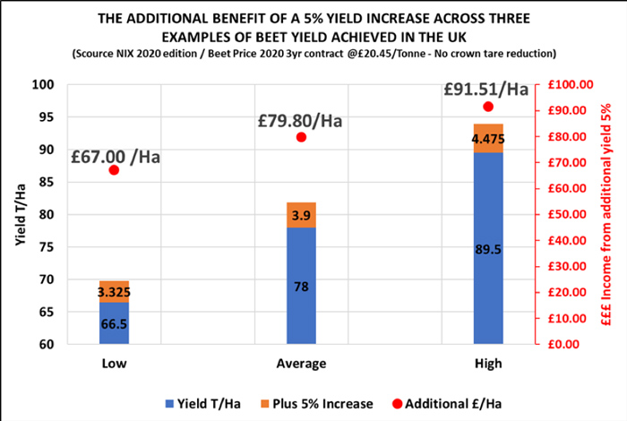 Increasing the yield by 5% on a crop yielding 66.5t/ha by 3.325t/ha brings a financial benefit of £67/ha. For a crop yielding 78t/ha, a 5% increase in yield of3.9t/ha is worth £79.80/ha and on a crop yielding 89.5t/ha an extra 5% benefit in yield of 4.475t/ha is worth £91.51/ha. This is based on a 2020 beet price, on a three-year contract at £20.45/t with no crown tare reduction.