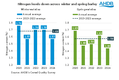For winter barley, the nitrogen content averaged 1.57%, down from 1.70% in 2023, but similar to 2021. In addition, specific weights are lower.