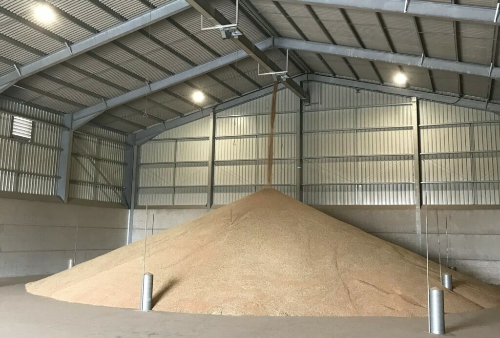 The dry grain is fed into the grain store by a Skandia KTIB 20/40 40tph curved chain and flight conveyor.