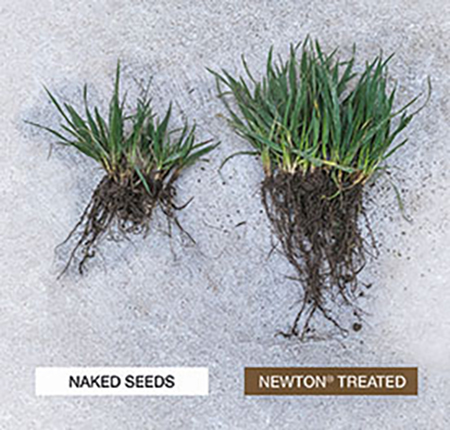 “It can be co-applied with naked seed or co-applied with a chemical or nutritional dressing, and being non-microbial, means it will last on the seed if drilling gets delayed and you need to over-year – there’s no risk of decay like a microbial dressing would do,” adds Stuart. “Just ask your seed merchant for Newton or ask your mobile seed treater to apply it like you would a traditional seed treatment.”