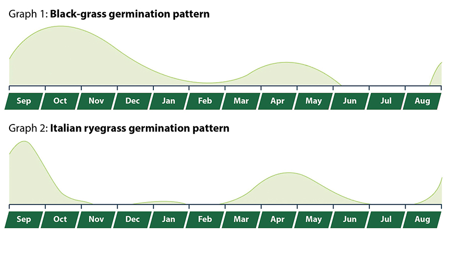 “Early October is peak germination for black-grass and ryegrass, so waiting another four or five days will help to control many more weeds before drilling the crop. You can base these short delays on the weather forecast rather than sticking to a timetable. Having some flexibility and being prepared to drill and spray at fairly short notice will help strike the balance between getting drilled up and good weed control.”