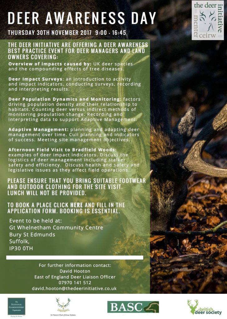 The Deer Initiative is offering a ‘Deer Awareness Best Practice’ event for deer managers and landowners, taking place on Thursday, 30th November in Suffolk.