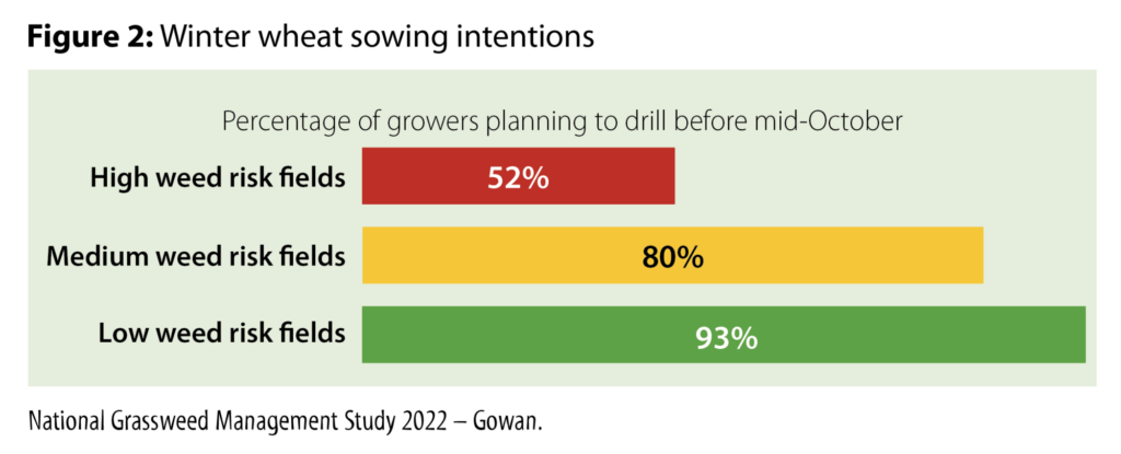 “Heeding the best advice, many growers are still setting mid-October as their target start date for wheat drilling on high grassweed risk fields to give time to spray-off the largest flushes of weed growth ahead of sowing. However, 52% are now looking to drill high risk fields and 80% medium-risk fields before this time – presumably to minimise their establishment risk from the weather (Figure 2).