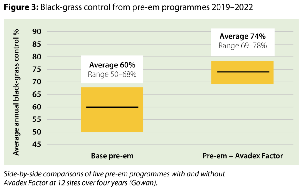 Encouragingly, the addition of liquid tri-allate (Avadex Factor) to these programmes boosted average control to 74% while halving the season-to-season variation (Figure 3).