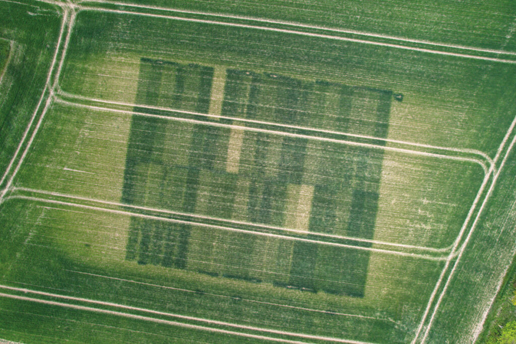 The drone image shows the nitrogen response trials from above, where there are clear differences in the strip plots.