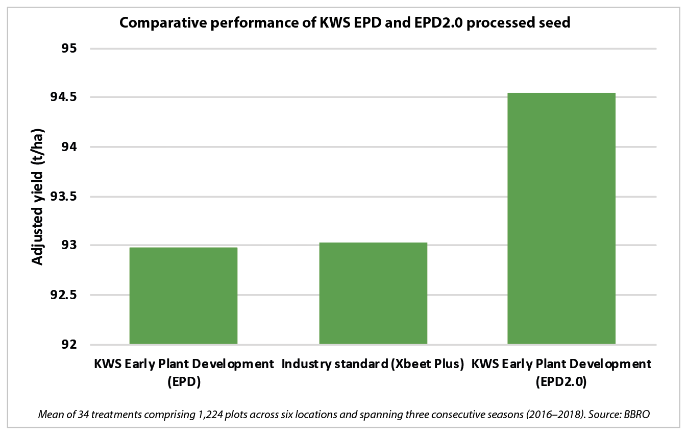 Several years of trials overseen by the BBRO have shown that the KWS pelleting process known as EPD2.0 and the first-generation process, EPD, perform strongly in the UK. “EPD2.0 gave a yield benefit of 1.5t/ha in the trials offering growers the choice of improved seed treatments on KWS seed,” says Mr Bishop.