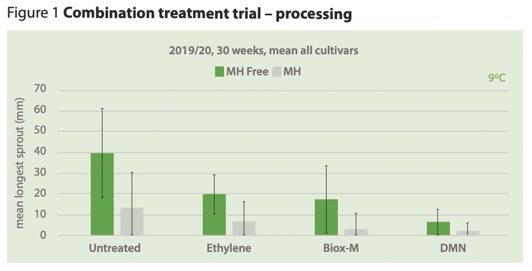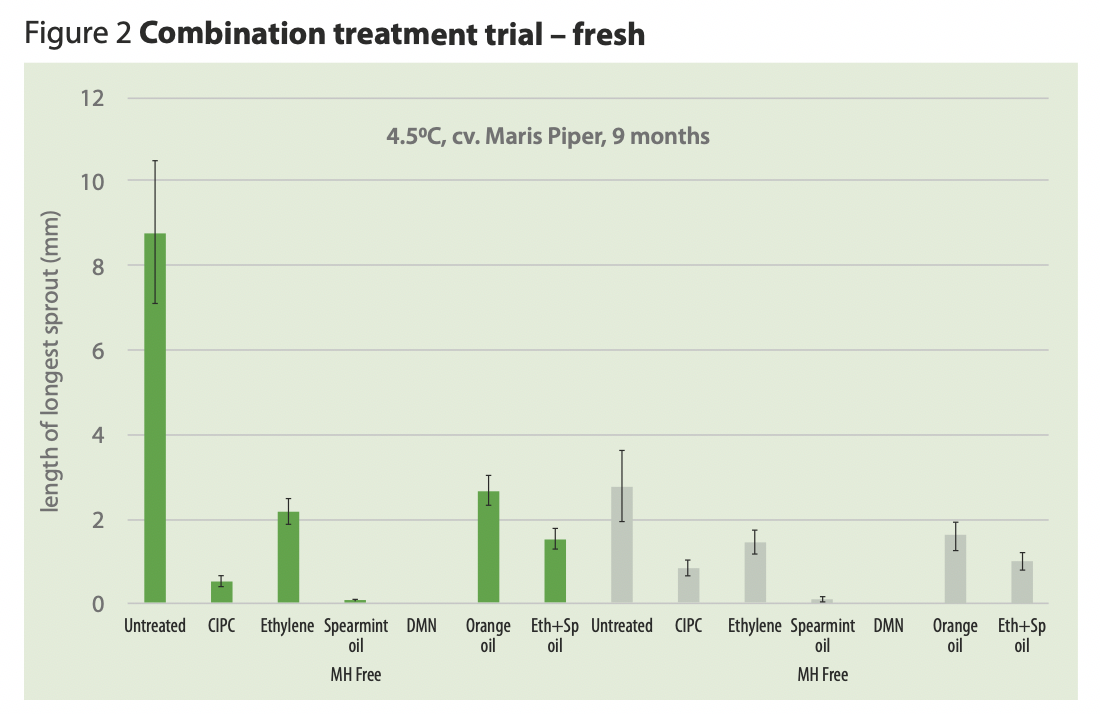 In combination treatment trials for both the fresh and processing markets, AHDB Potatoes found that the use of maleic hydrozide (MH) in addition to the other chemical options gives a significant improvement of sprout control over MH-free and this residual control is something that needs to be understood better (see Figures 1 and 2).