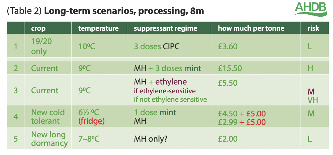 Of course, cost is always going to be a driving factor when deciding on treatment options. Table 2 suggests some long-term storage scenarios for the processing market, comparing price for each suppressant regime and comparing the level of risk. One thing is clear from the data – particularly for long-term storage, the main consideration is that we need newer longer-term dormant varieties which don’t require such reliance on chemicals.