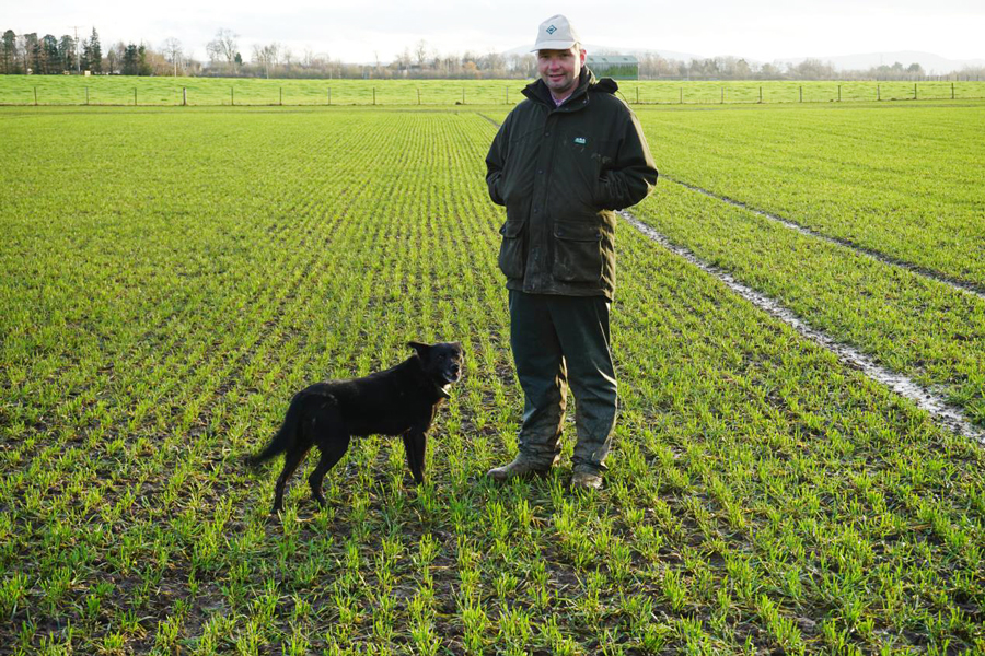 Iain Wilkinson standing in a field of winter wheat which had been grazed hard by lambs until it was fairly black looking. The image was taken one week later having recovered well.