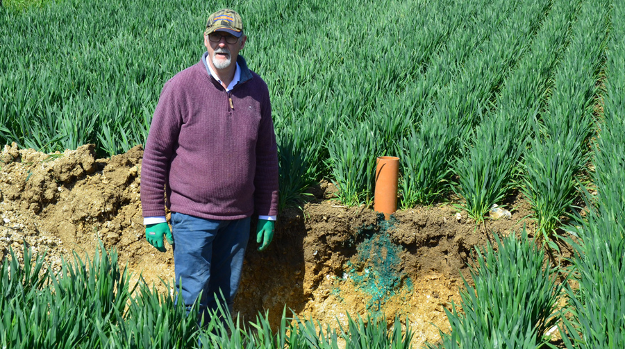 Dick Neale, technical manager of Hutchinsons, who has surveyed soils on the Claydon farm and found them to be in optimum condition, with excellent structure and permeability, used coloured dye to highlight how worm burrows allow water to permeate the profile and root structures to develop. He stated: