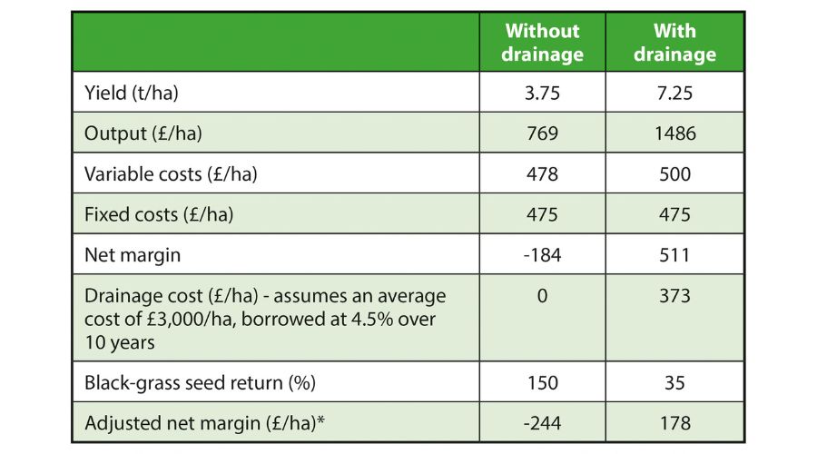 *Note: Adjusted net margin assumes additional inversion cultivation cost of £60/ha to address extra seed return without drainage, and a herbicide saving of £40/ha where drainage has been improved and seed return is lower.