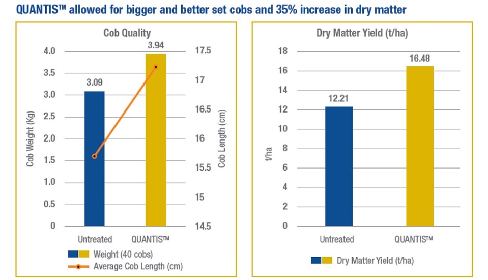 Maize crops stand to make big gains in cob quality and dry matter yield with Quantis for stress relief through the crucial pollen development stage at flowering, along with any subsequent heat events.