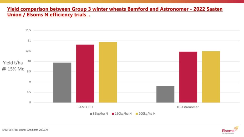 Group 3 winter wheat Bamford outyielded LG Astronomer, despite early N sampling tests recording the Astronomer crop as containing a higher amount of N.