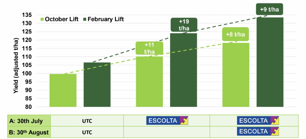 “Those with crops to be lifted from mid-October onwards should apply a second application of Escolta about four weeks after the first, in the case of this season, likely to be towards the end of August. Its also worth noting that Escolta delivers exceptional yield protection with crops last year receiving two sprays yielding 19t/ha more on average than untreated crops,” he adds.