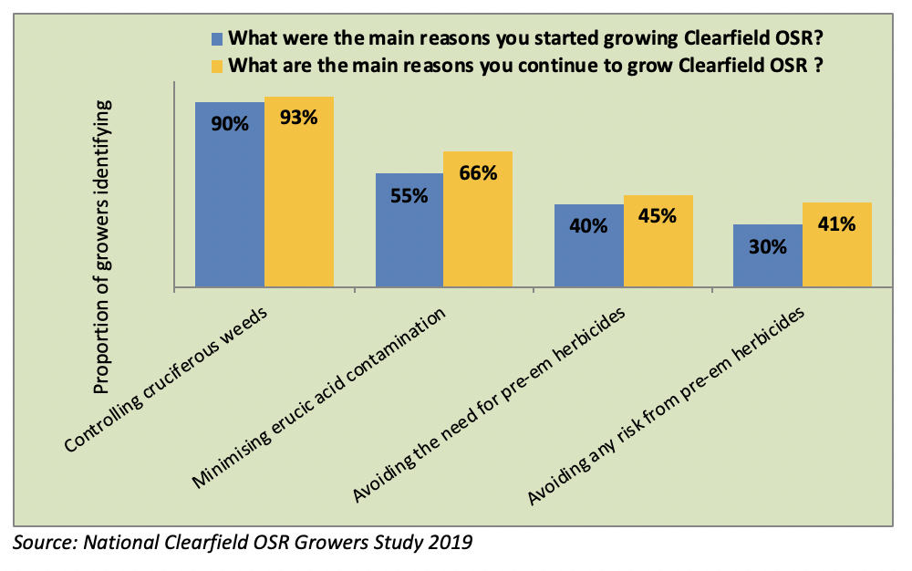 Involving farms across the country growing more than 13,000ha of OSR, the 2019 study shows controlling cruciferous weeds remains a key driver behind Clearfield OSR growing. However, the proportion of growers seeing CL varieties as valuable in minimising the risk of erucic acid contamination from weeds and volunteers has increased sharply (Figure).