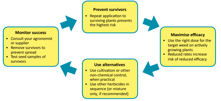 There are fundamental stewardship steps that all farmers using glyphosate need to take. On top of that, farmers with higher risk systems have to be extra vigilant and consider adjusting their approach to reduce selection pressure for glyphosate resistance.