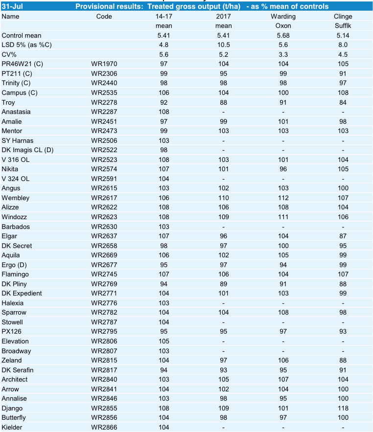 Based on the four-year average values, where new 2017 data is available, the highest-yielding varieties to date are V316 OL (108%), Alizze (108%), Windozz (108%), Elgar (107%) and Flamingo (107%).