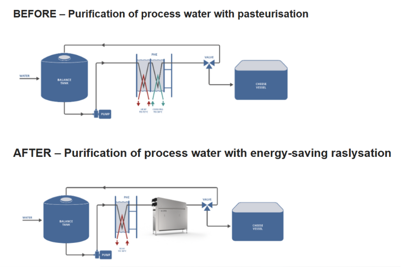 Raslysation effectively inactivates all microorganisms and can therefore often fully replace the traditional heat treatment of both water and product.