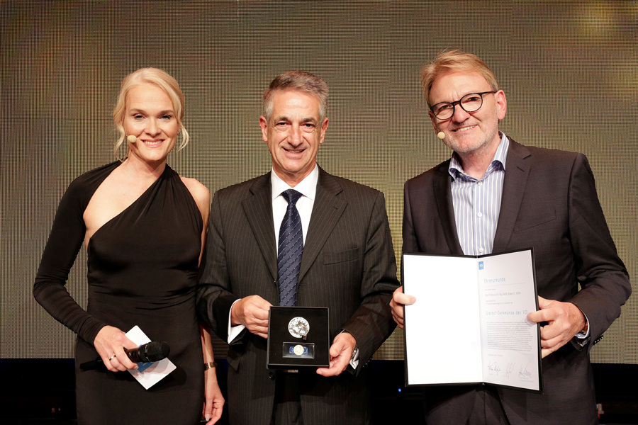 The Grashof Commemorative Medal was handed over to Prof Klaus Hoehn (centre) by VDI President Volker Kefer and event presenter Antje Grobe.