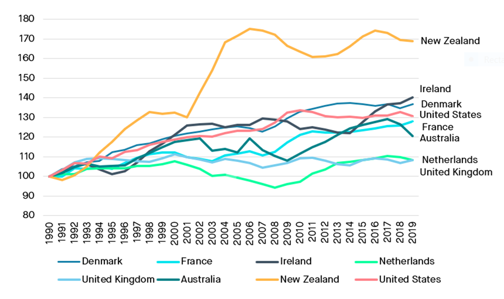 International comparison of total factor farm productivity. Base (100) = three-year average to 1990. (Source: US Department of Agriculture) Image © The Social Market Foundation
