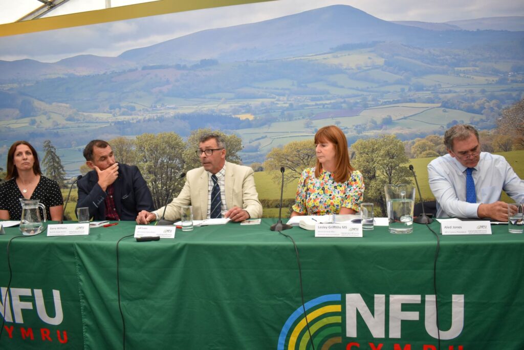 Speakers at the NFU Cymru seminar included (from right to left): NFU Cymru president Aled Jones; rural affairs minister Lesley Griffiths; tenant dairy and beef farmer Jeff Evans; upland farmer Garry Williams; and upland farmer Bryony Gittins.
