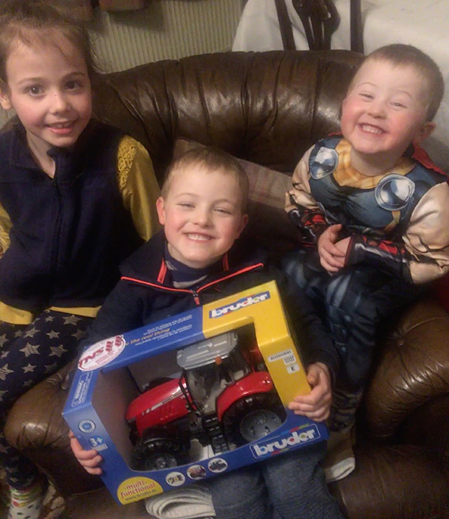 Eabha, Fionn and Cian Munslow pictured with their Massey Ferguson 7624 model tractor kindly donated by Thurlow Nunn Standen.
