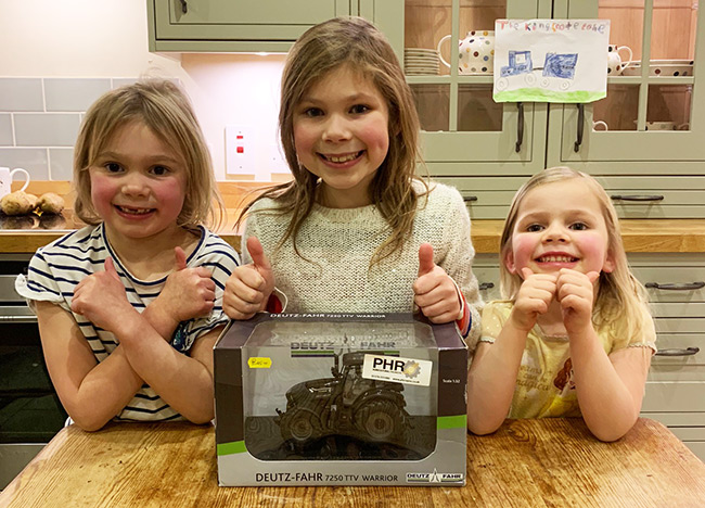 Charlotte, Lara and Edith Nichols, Glos, pictured with their prize, a Deutz-Fahr 7250 TTV Warrior model tractor kindly donated by PHR Rayne.