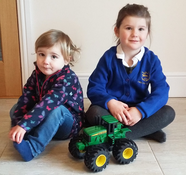 Lorna Harris, Cornwall, pictured with her sister Grace and her John Deere monster treads toy kindly donated by SPS Parts.