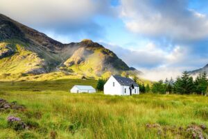 A traditional croft cottage at Glencoe in the Scottish Highlands.