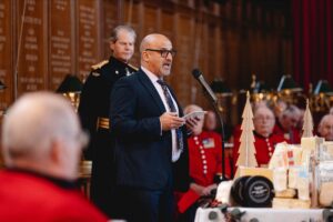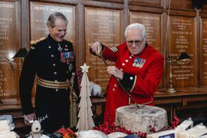 Cutting this year’s 25kg (55lb) ceremonial Montgomery cheddar was Michael Allen. Michael joined the army aged 15 as a boy apprentice in 1957 and was badged to the Royal Military Police. Reaching adulthood, he then served in Kenya in 1961, in France from 1963 until 1966 and then joined the Far East Land Force in Borneo. He spent the remainder of his service alternating between Northern Ireland and Germany and he was eventually discharged in 1982 having served for 24 years and after being promoted to the rank of Sergeant. Michael then joined the Royal Hospital Chelsea in 2007.