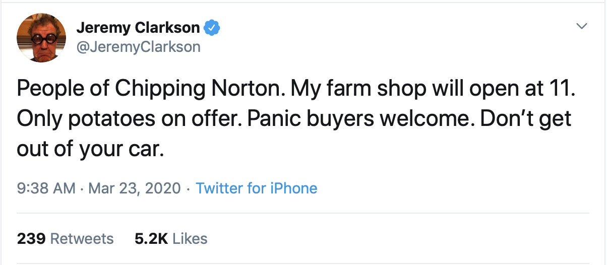 Clarkson’s farm shop – called Squat Shop – is open and currently stocking only potatoes. In a post on Twitter, he wrote: ‘People of Chipping Norton. My farm shop will open at 11. Only potatoes on offer. Panic buyers welcome. Don’t get out of your car.’
