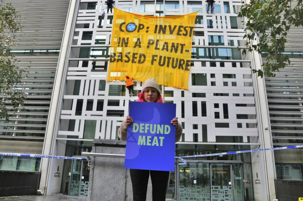 Once in position on the front of the building, the protesters unveiled a large orange banner that reads ‘COP: Invest in a Plant-Based Future’.