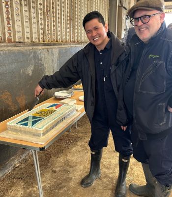 Benji and Andy are cutting a cake which show both the Saltire and the Filipino flag and illustrates the essential relationship between farms in SW Scotland and their Filipino employees.