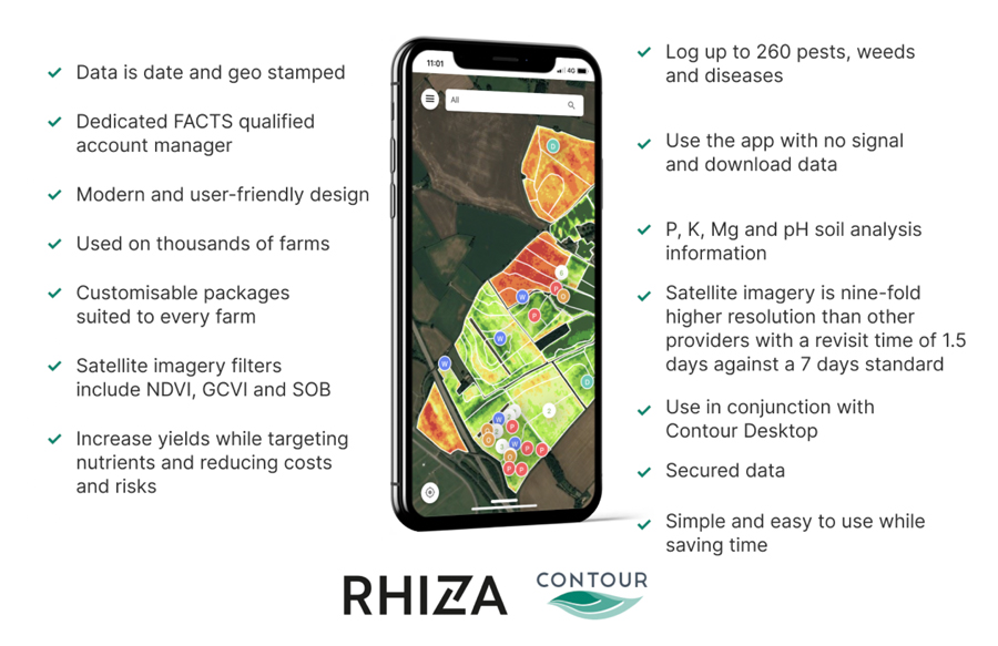 RHIZA, a digital agronomy service chosen by Agrii as their digital and precision partner, has been working with farmers for over twelve years. In its simplest form, the system allows you to log in and automatically transfer geo-referenced observations created when field-walking, to the Contour desktop platform. All you need is a phone or tablet with GPS and the Contour Mobile app. You and your adviser use this to record and share information and pictures on areas of interest or concern, so you can target management action throughout the season. Working with your dedicated RHIZA account manager to determine an action plan, you can then relate these observations to field performance.