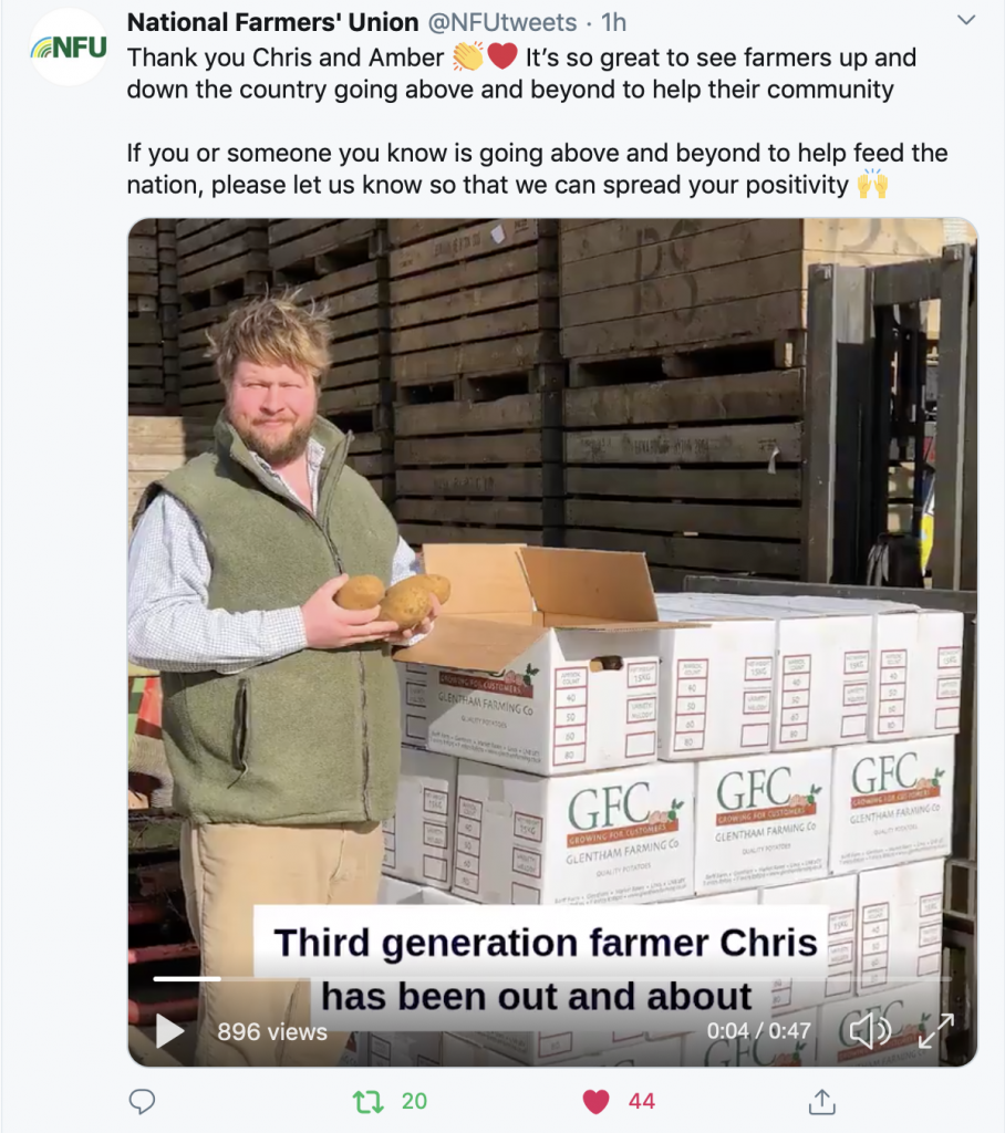 A glance at social media reveals an almost endless number of similar acts of kindness and community spirit among farmers up and down the UK. Third generation farmer Chris and his wife Amber have also been out delivering bags of potatoes to vulnerable people in their local community in Lincolnshire, after their local parish identified a list of residents unable to get to their shops.