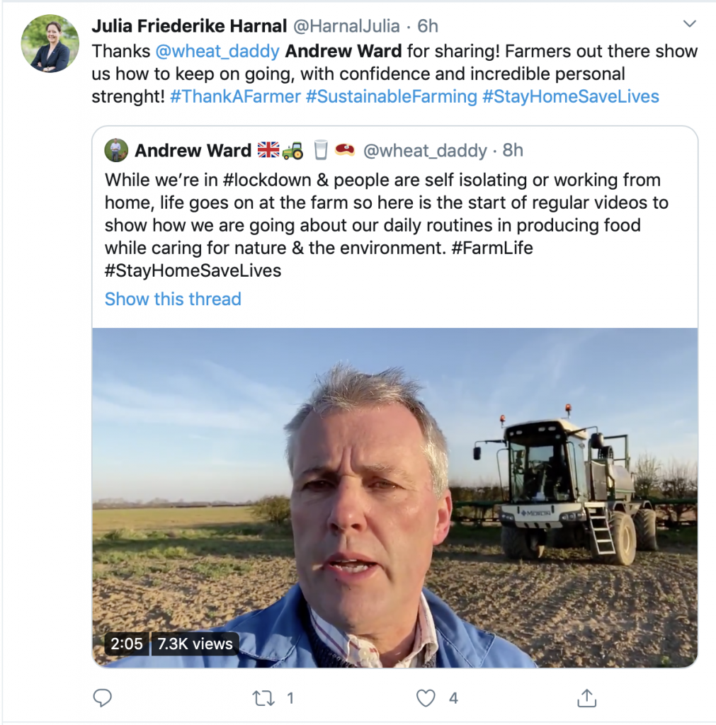 “What I want to get across is that we are still farming even though the country is in lockdown, but we’re taking the virus extremely seriously and putting in lots of measures to keep contamination out. With so many people at home and on social media it is an ideal opportunity to help bridge the gap between urban life and the countryside, and dispel any myths that farmers don’t care about the environment and climate change. We care about the same things that everyone else cares about.”