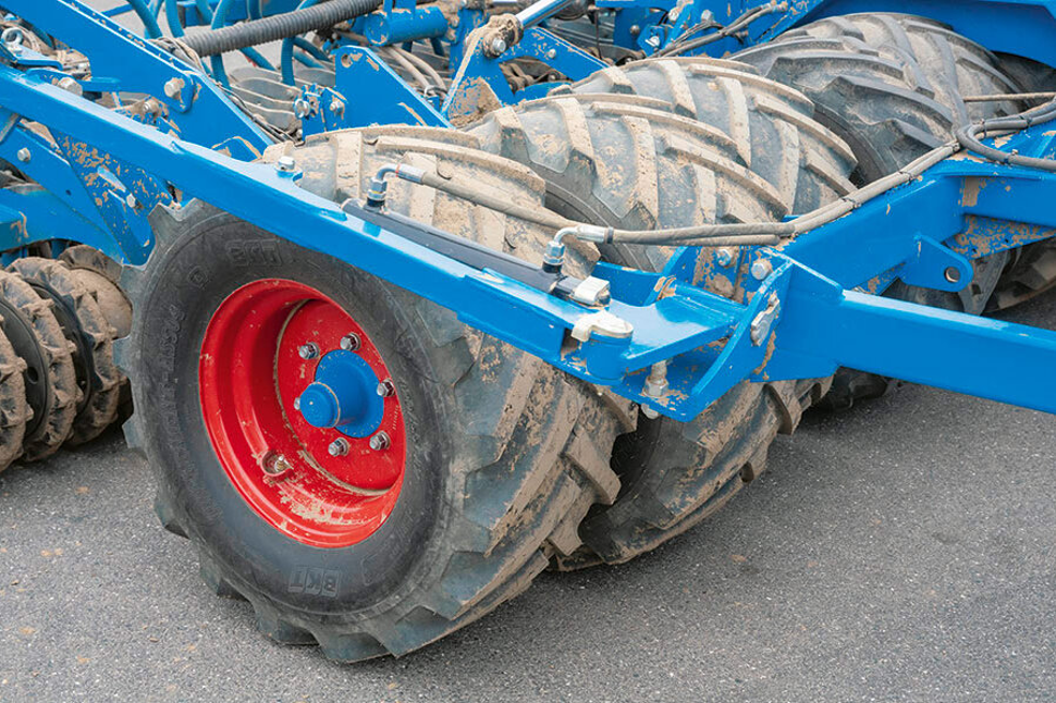 The tyre packer roller not only serves a transport function but also ensures that the entire seedbed is reconsolidated evenly. The generously dimensioned tyre packer roller with a 90-cm diameter ensures even reconsolidation across the full seedbed. The staggered arrangement of the individual wheels additionally leads to better self-cleaning and ensures good sowing, even in wet conditions.