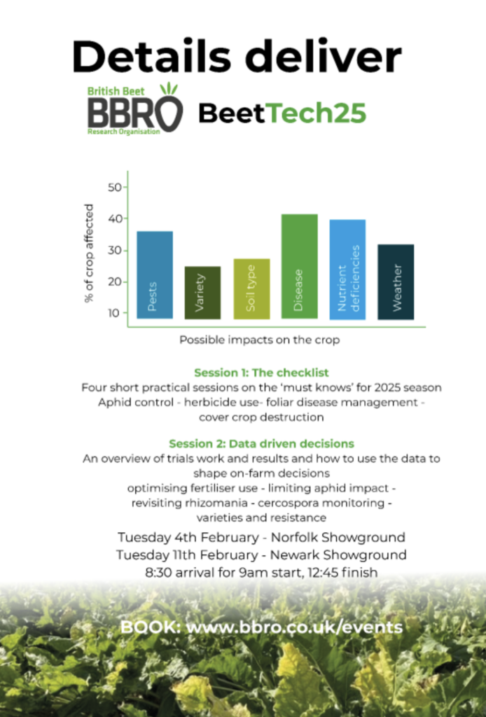 The British Beet Research Organisation (BBRO) is hosting BeetTech2025 on Tuesday 11th February 2025 at the Newark Showground. Attendees can arrive from 8:30am for a 9am start, finishing at 12:45pm.