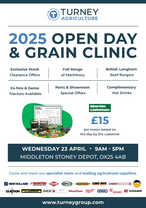 The Turney Agriculture Open Day & Grain Clinic is back on Wednesday 23rd April at the Middleton Stoney Depot. Last year was a great success and we were happy to see so many take time out of their busy farming schedule to attend. Highlights included New Holland’s brand new methane-powered tractor and CR Combine, a busy grain clinic, limited-time offers on machinery (many of which were snapped up!), and plenty of kit on display in the field and yard. The team is looking forward to welcoming customers old and new again this year and sharing their expertise on Turney’s products and services over a burger and a coffee.