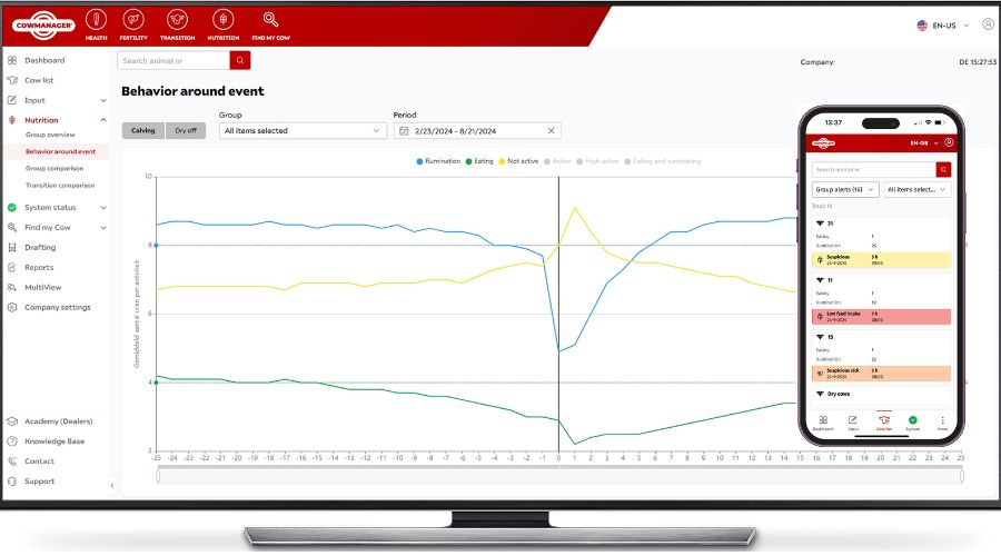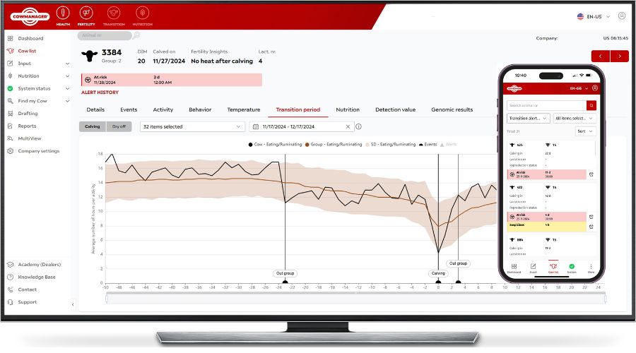 CowManager Transition Module supports farmers by identifying cows at increased risk of health problems from up to 50 days before calving until 25 days after.