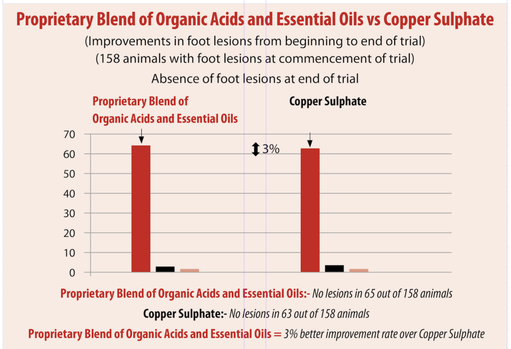 Published studies comparing the microbiological efficacy of organic acids/TTO showed that Hoofsure Endurance was more effective than both copper or formalin against bacteria, had a quicker onset of action, and was more effective in the presence of organic matter in lab studies. See figures 1 and 2 for a summary of independent field studies.