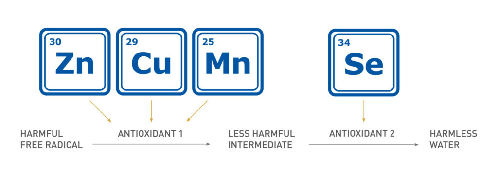 In addition, all four of these trace minerals are required by the body to form the antioxidant enzymes superoxide dismutase (SOD) and glutathione peroxidase (GPx), essential in protecting against the effects of oxidative stress.