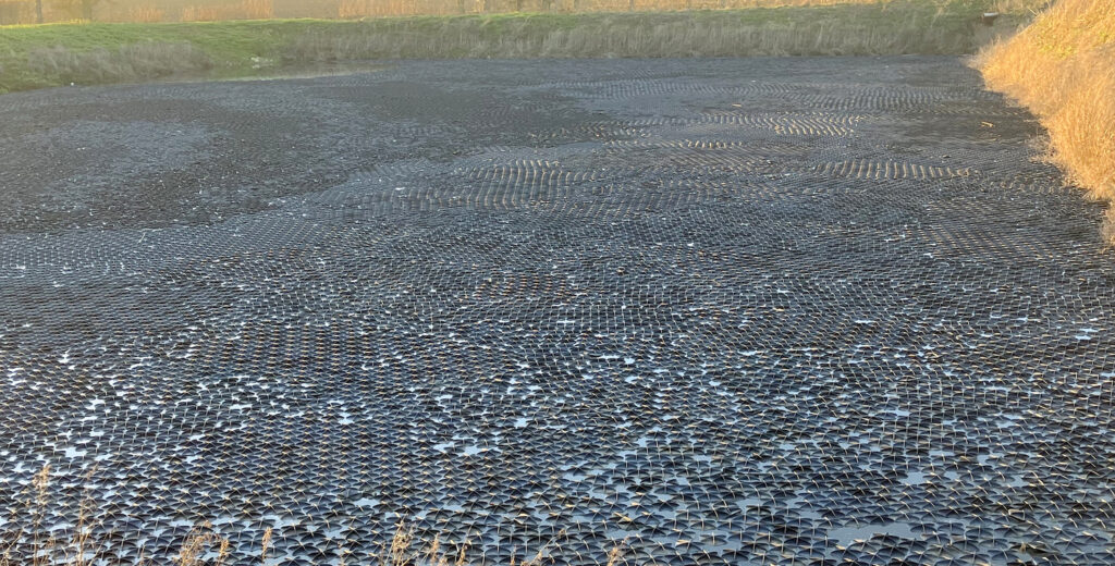 - Floating tiles (such as Tramspread’s Hexa-Cover): These don’t keep rainwater out of the store but are very easy to install, quite cheap and have a much longer lifespan than fabric, John said. They are a really good alternative to fabric covers and particularly well suited to older circular tanks that lack the structural integrity to cope with one of the tensioned covers – as well as odd-shaped slurry lagoons that are difficult to cover with a fabric solution. The lagoon doesn’t need to be emptied and cleaned to install the 8in tiles, which are made from recycled plastic. The tiles are simply poured over the surface, where they organise themselves into symmetrical patterns. They can reduce emissions by up to 96%, John said.