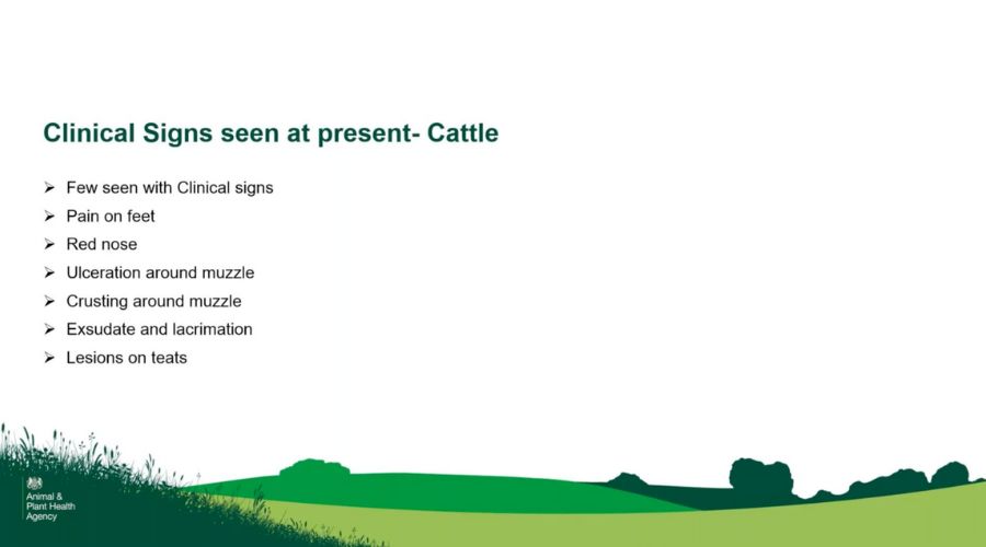 Few cattle in the UK are showing clinical signs of BTV-3 but those that are symptomatic may have pain in the feet, red nose, ulceration or crusting around muzzle, exudate and lacrimation and teat lesions.