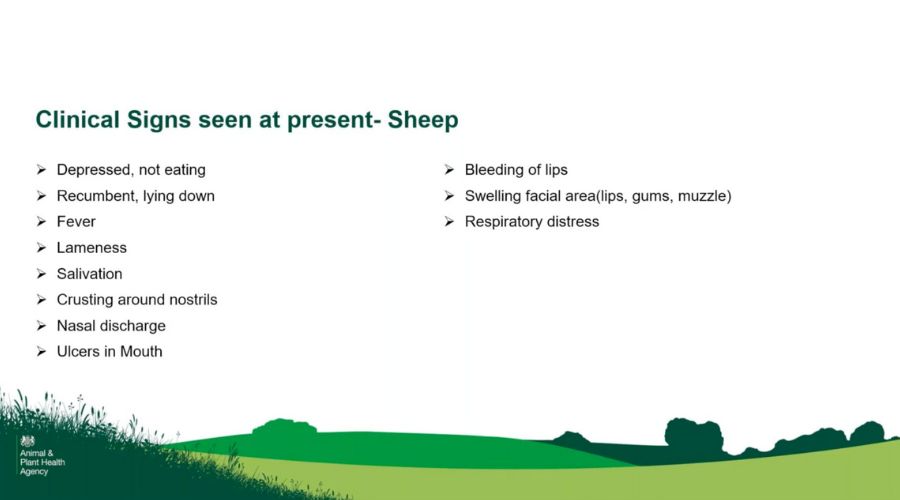 In sheep, signs include: fever, lameness, salivation, crusting around nostrils, nasal discharge, ulcers in the mouth, bleeding of lips, facial swelling (lips, gums, muzzle) and respiratory distress.