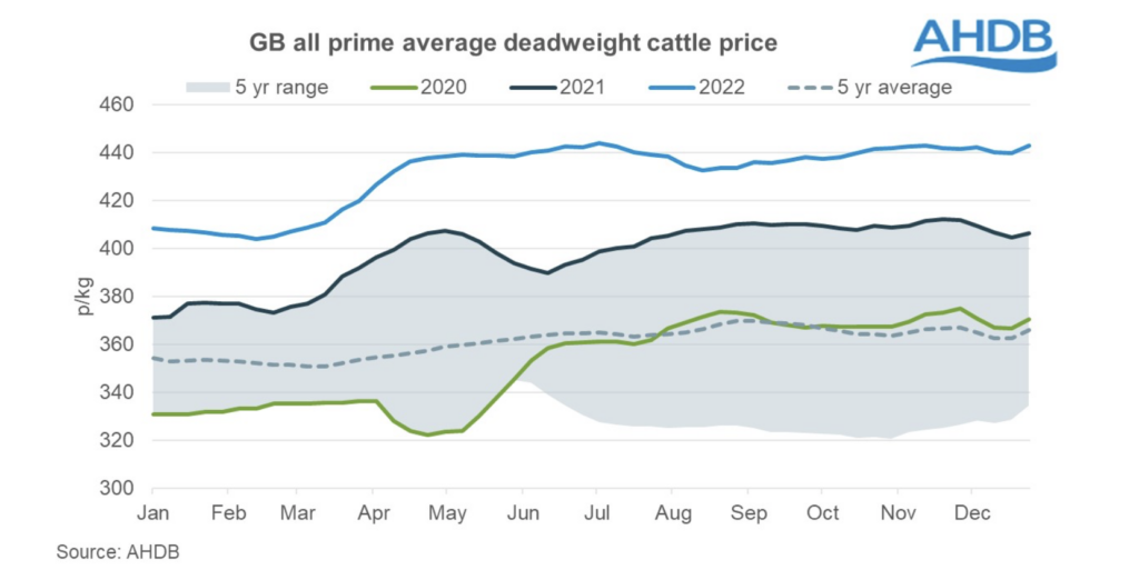Average prices for all prime cattle peaked at 448.1p/kg in the final week of December – the highest price on record (back to 2014), according to AHDB figures.