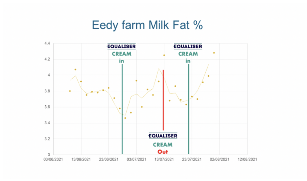 Results from a grazing herd, where cows experienced a drop of 0.5% in milk fat in spring and where levels stayed at or below 3.5% while at grass and typically failed to recover during the grazing season, the addition of Equaliser Cream reversed the drop very quickly – in a matter of days – and brought levels back up to the 4% level.