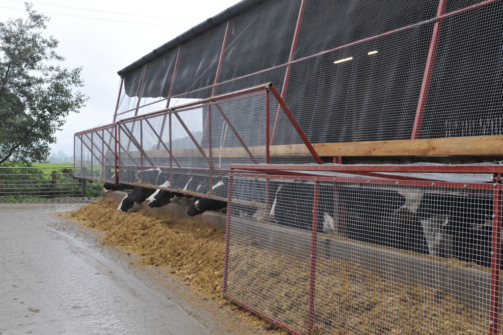 Protecting feed passages on the outside of buildings was one of the biggest challenges but it was achieved with cage-like canopies which can be raised off the passage when the feed wagon is depositing the ration and winched back into position when cattle are feeding.